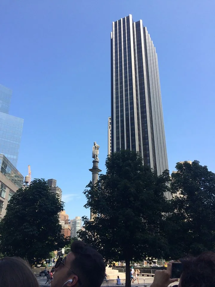 Columbus sits atop his column in the middle of his eponymous circle. Behind him, Trump Tower.