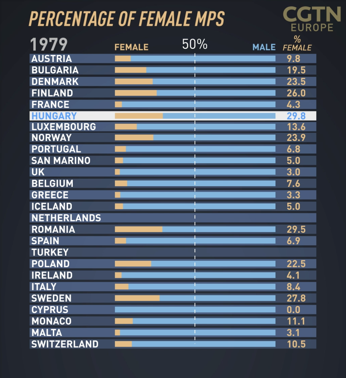 To find out, CGTN Europe analyzed data from the Inter-Parliamentary Union (IPU). This 130-year-old global organization of national parliaments records the proportion of elected female representatives, be they called MPs, assembly members or anything else.
